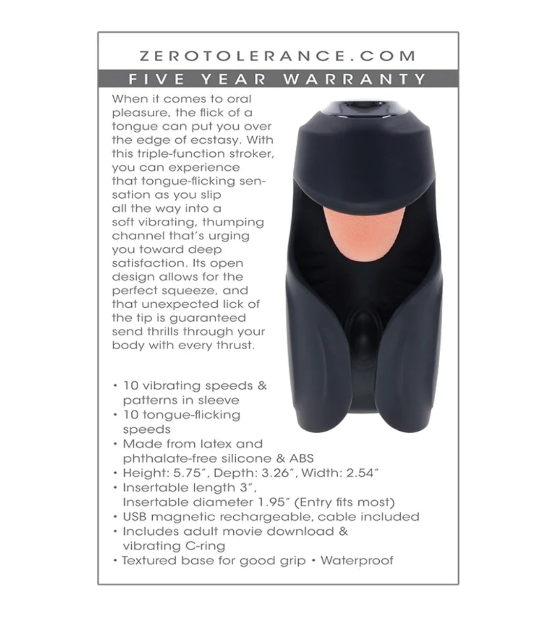 When it comes to oral pleasure, the flick of a tongue can put you over the edge of ecstasy. With this triple-function stroker, you can experience that tongue-flicking sensation as you slip all the way into a soft vibrating, thumping channel that’s urging you toward deep satisfaction. Its open design allows for the perfect squeeze, and that unexpected lick of the tip is guaranteed send thrills through your body with every thrust.